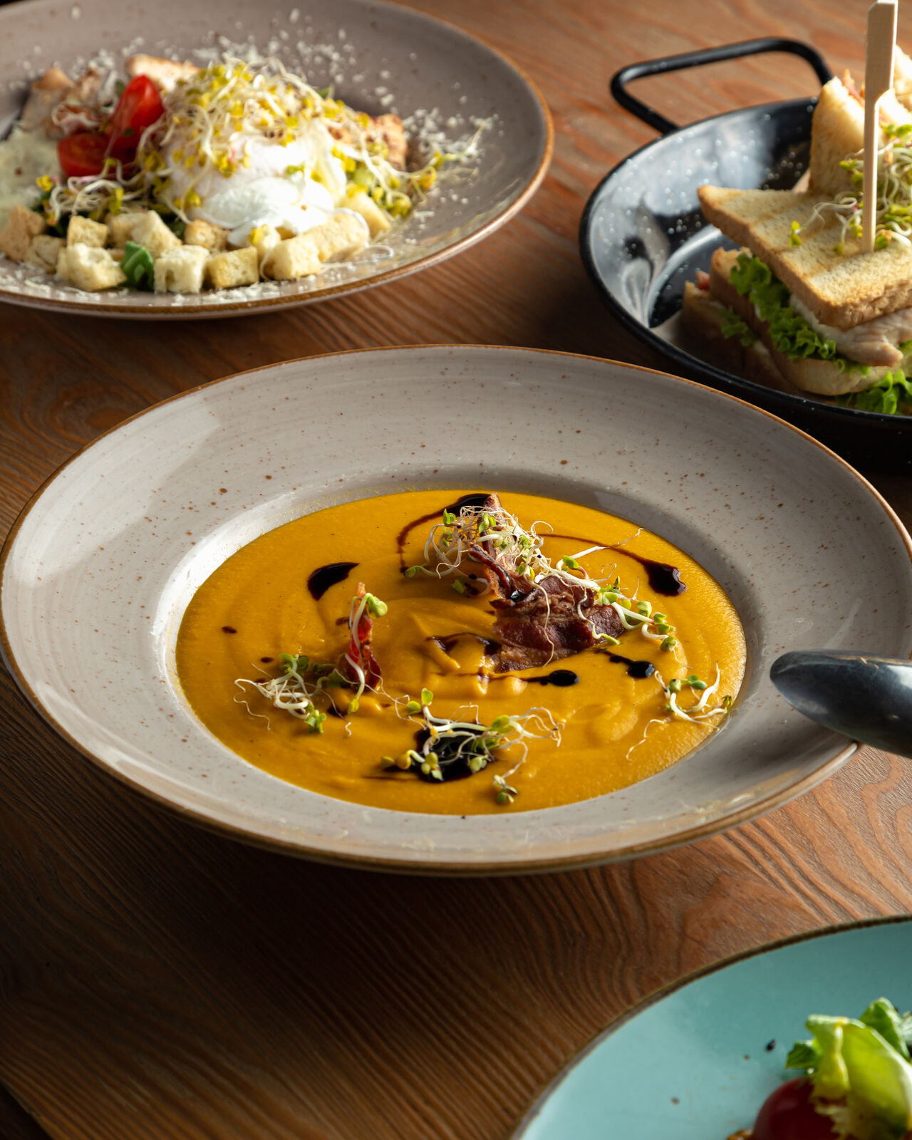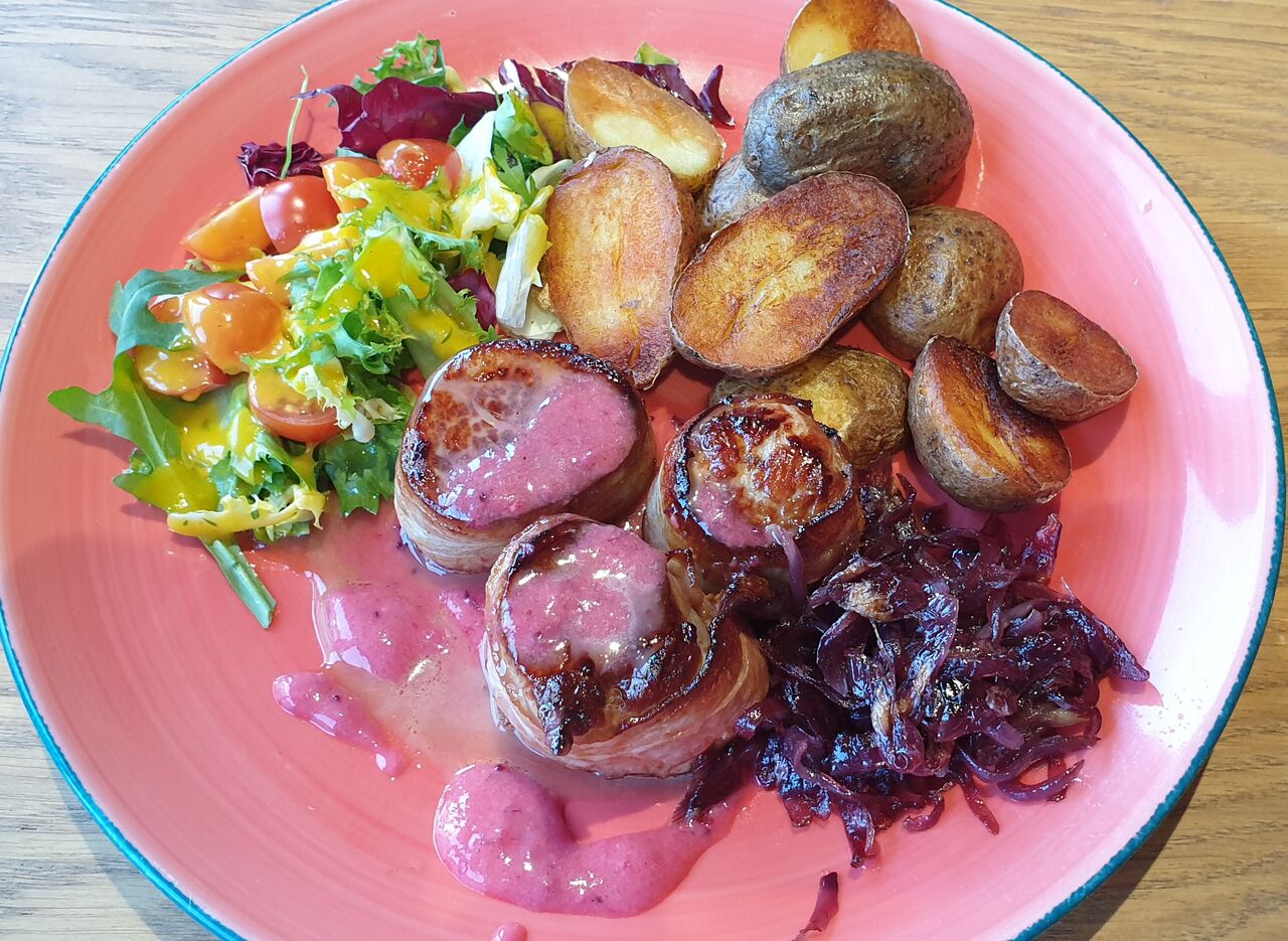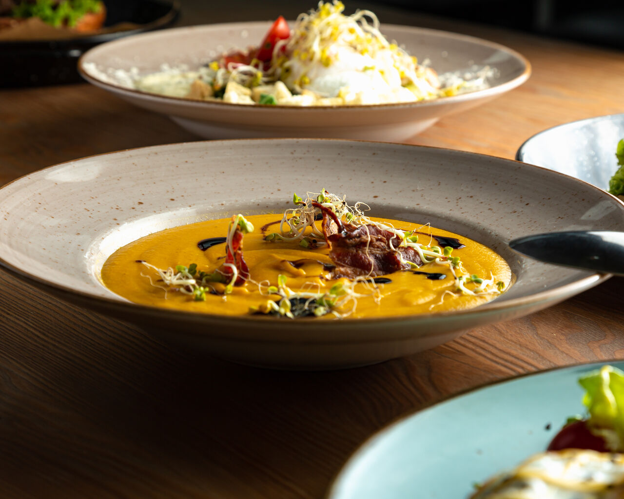 Nasza europejska kuchnia oferuje Wam różnorodność pysznych, świeżych dań w tym aż 12 propozycji śniadań. Jesteśmy znani z Naszych lokalnych produktów i regionalnych produktów takich jak np jaja z wolnego wybiegu z certyfikatem. Spróbuj Naszej aromatycznej kawy, której ziarna mają certyfikaty fair trade, świeżo przygotowywanych smoothies, pysznych wrapów, makaronów, makaronów. Oferujemy również coś dla osób lubiących słodkości – wypróbuj nasze smaczne ciasta i desery, o każdej porze dnia. Naszą pasją jest podawanie Tobie tylko tego, co najsmaczniejsze – więc wpadnij do nas na śniadanie, brunch, obiad albo kolację. Skorzystaj z naszego bezpłatnego Wi-Fi, aby np udostępnić swoje zdjęcia. Podczas rodzinnego pobytu Twoje dzieci miło spędzą czas nie tylko przy stole, ale także i w naszym kąciku dziecięcym. Jesteśmy lokalem bez barier. Jesteśmy lokalem przyjaznym dla zwierząt.